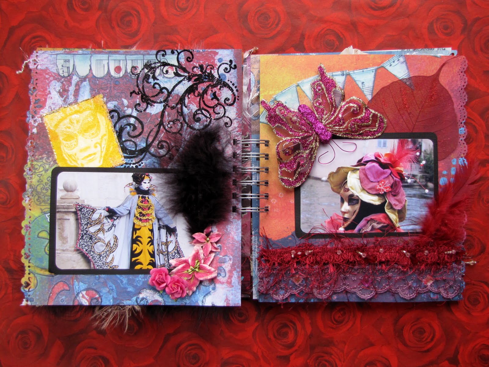 J'ai essayé pour chaque page de reprendre dans les couleurs et les décos des éléments décoratifs des costumes ou masques présents sur les photos, allez place aux images ! Il y en a beaucoup bon courage :